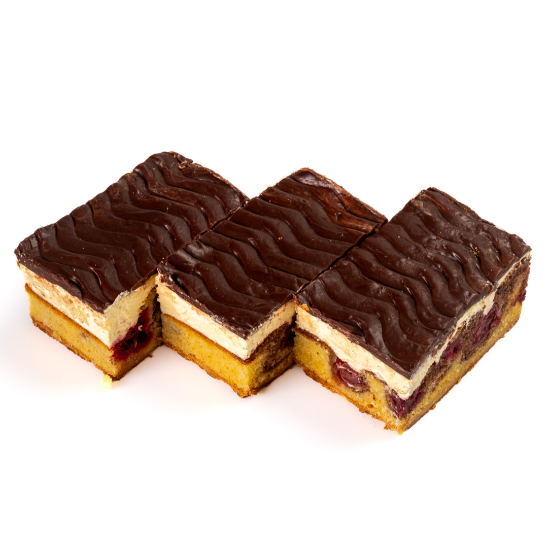 Unsere Donauwelle ist besonders saftig und begeistert mit einer perfekten Kombination aus weichem Teig, cremiger Buttercreme und einer glänzenden Schokoladenglasur. Die Kirschen im Inneren sorgen nicht nur für eine fruchtige Note, sondern tragen auch dazu bei, dass die Donauwelle schön saftig bleibt – ein Genuss, der immer überzeugt!